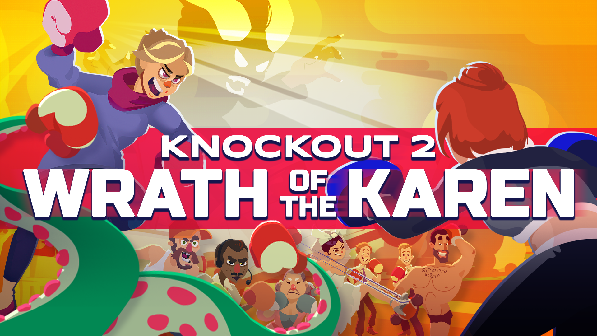 In Knockout 2: Wrath of the Karen, a puzzle-boxing spectacle fighting game, take the role of an FBI agent (the bureau of Federal Boxing Investigations) tasked with uncovering the sinister secret behind a rise in wanton entitled law-breaking worldwide.